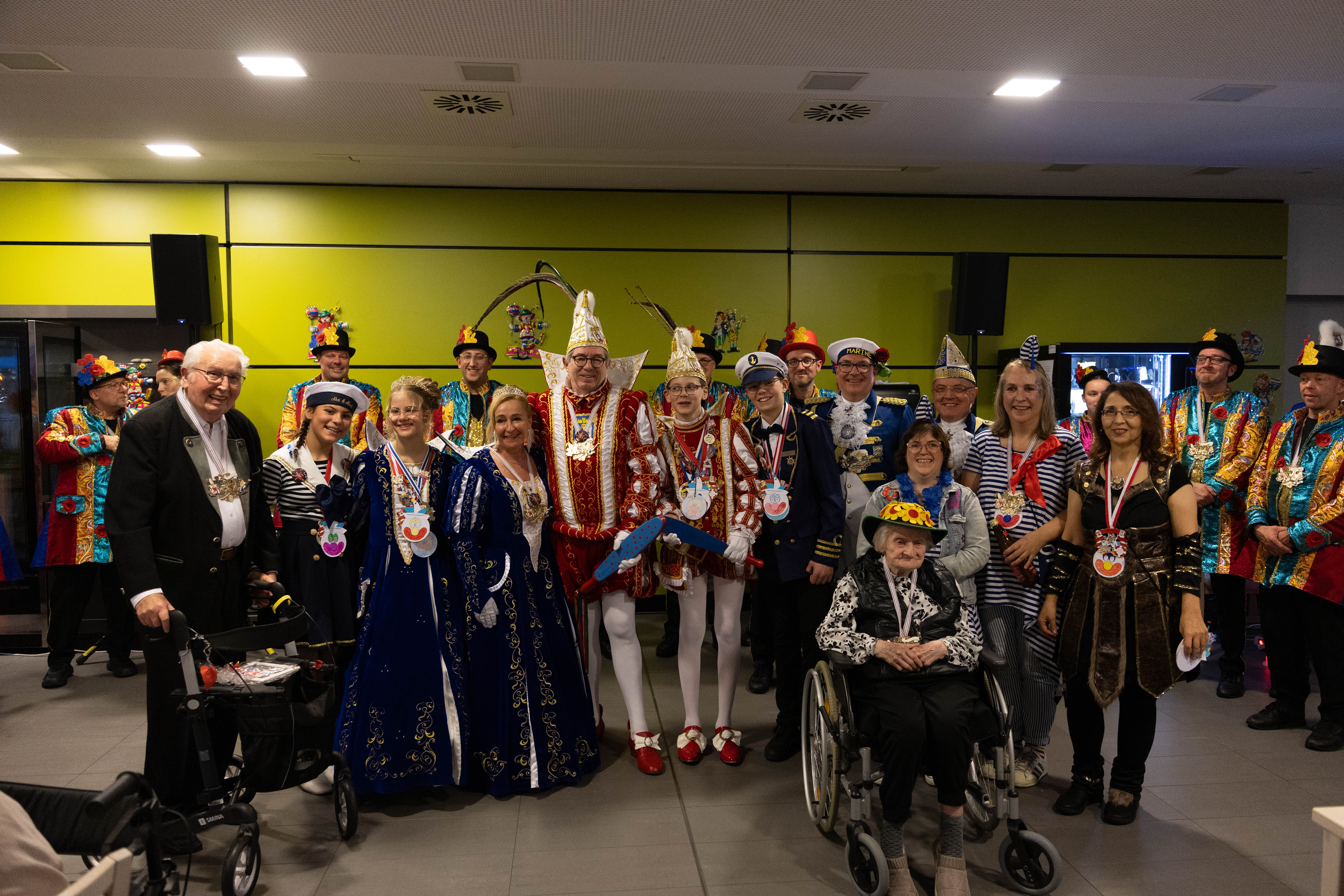 Selbstverständlich durfte man an diesem Nachmittag auch das Siegburger Kinderprinzenpaar, Prinz Markus III. und Siegburgia Madeleine I., mit ihrem Matrosen-Gefolge sowie natürlich auch das „große“ Prinzenpaar der Stadt Siegburg, Prinz Helmut IV. und Siegburgia Elke I. mit seinen „Jecken vum Rosenhügel“ begrüßen. Im Rahmen ihrer Auftritte wurden in beiden Häusern traditionell die ältesten anwesenden Heimbewohner(innen) geehrt. So erhielten im Altenheim „Am hohen Ufer“ Irmgard Nawotka (95) und Paul Kramer (98) sowie bei der Sitzung des Hauses in der Heinrichstraße Paula Schmitz (100) und Rudolf Korn (94) sowohl Präsente als auch die Prinzenorden der „kleinen“ und „großen“ Siegburger Tollitäten sowie natürlich den in beiden Häusern alljährlich von den Seniorinnen und Senioren handgefertigten eigenen Karnevalsorden.